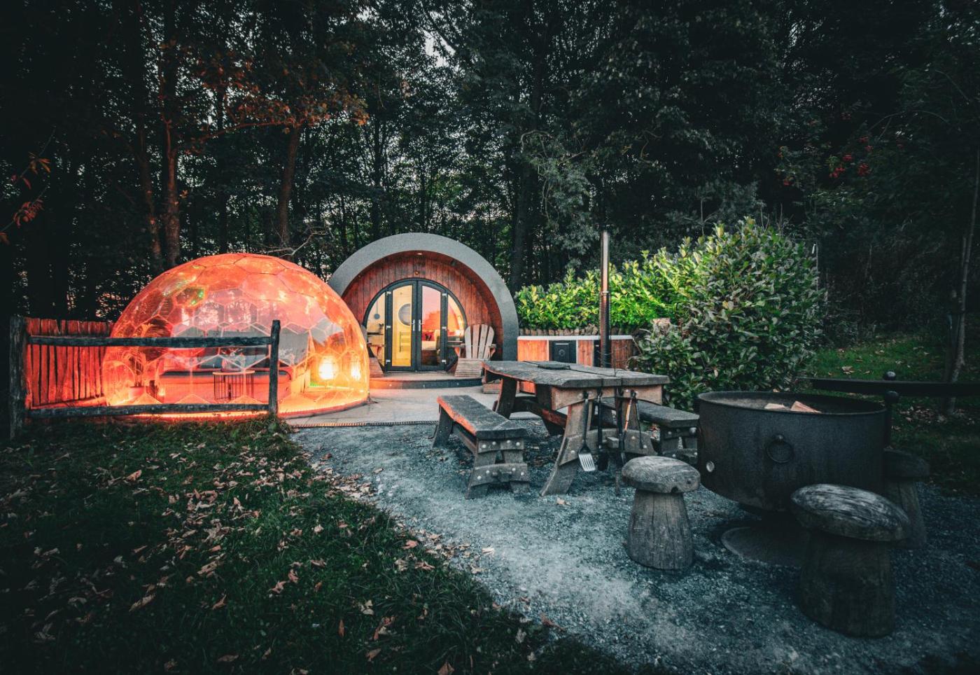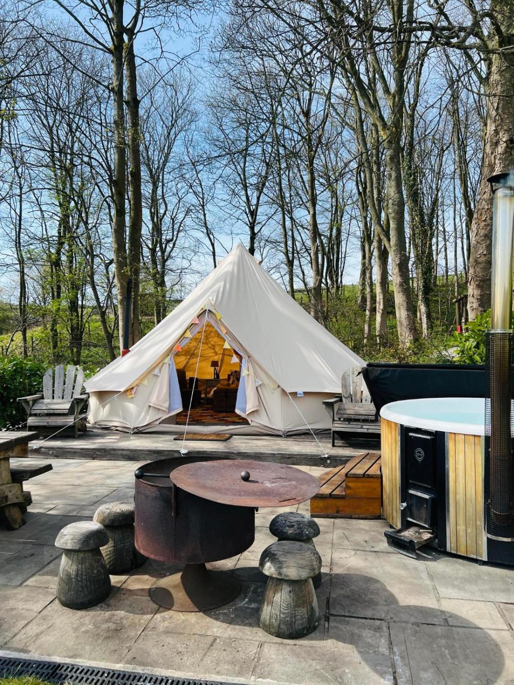 Tent. Guests will have a special experience as this tent offers a hot tub and a fireplace. This tent has a shared bathroom, a seating area, an electric kettle as well as a patio. The unit has 1 bed and 2 futons.