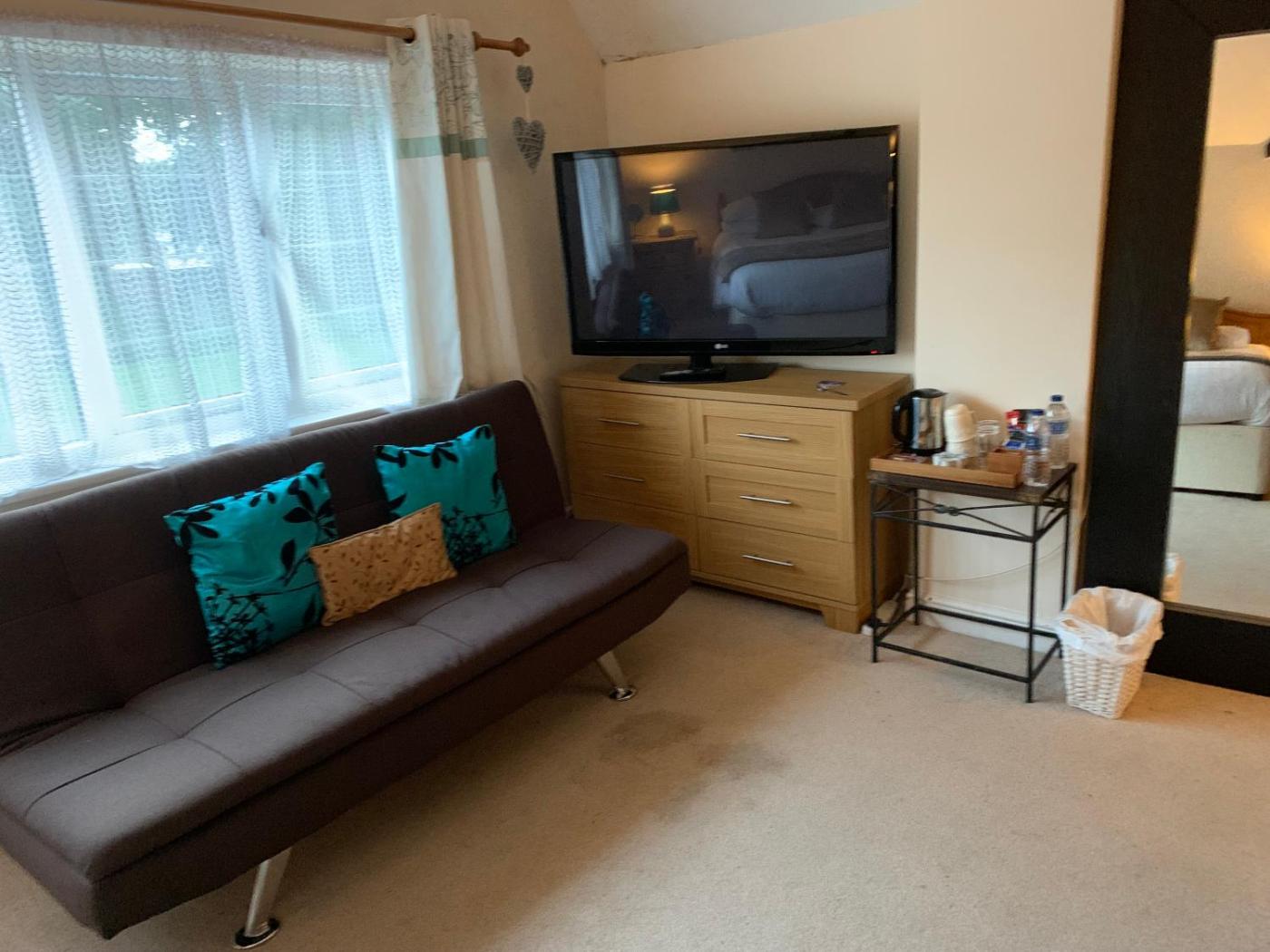 Triple Room. The triple room provides heating, as well as a shared bathroom boasting a bath. The triple room offers a wardrobe, an electric kettle, a carpeted floor, a flat-screen TV, as well as garden views. The unit has 1 bed and 1 futon.