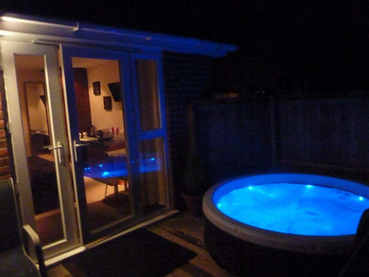 Double Room - Annex (Brick Built) with Hot Tub. This Double Room has a private decking area with outdoor table and chairs. It benefits from a fridge, toaster, kettle and ironing facilities. This room offers access to the seasonal swimming pool in the summer months. This room offers a private Hot Tub open from 9am-11pm ;