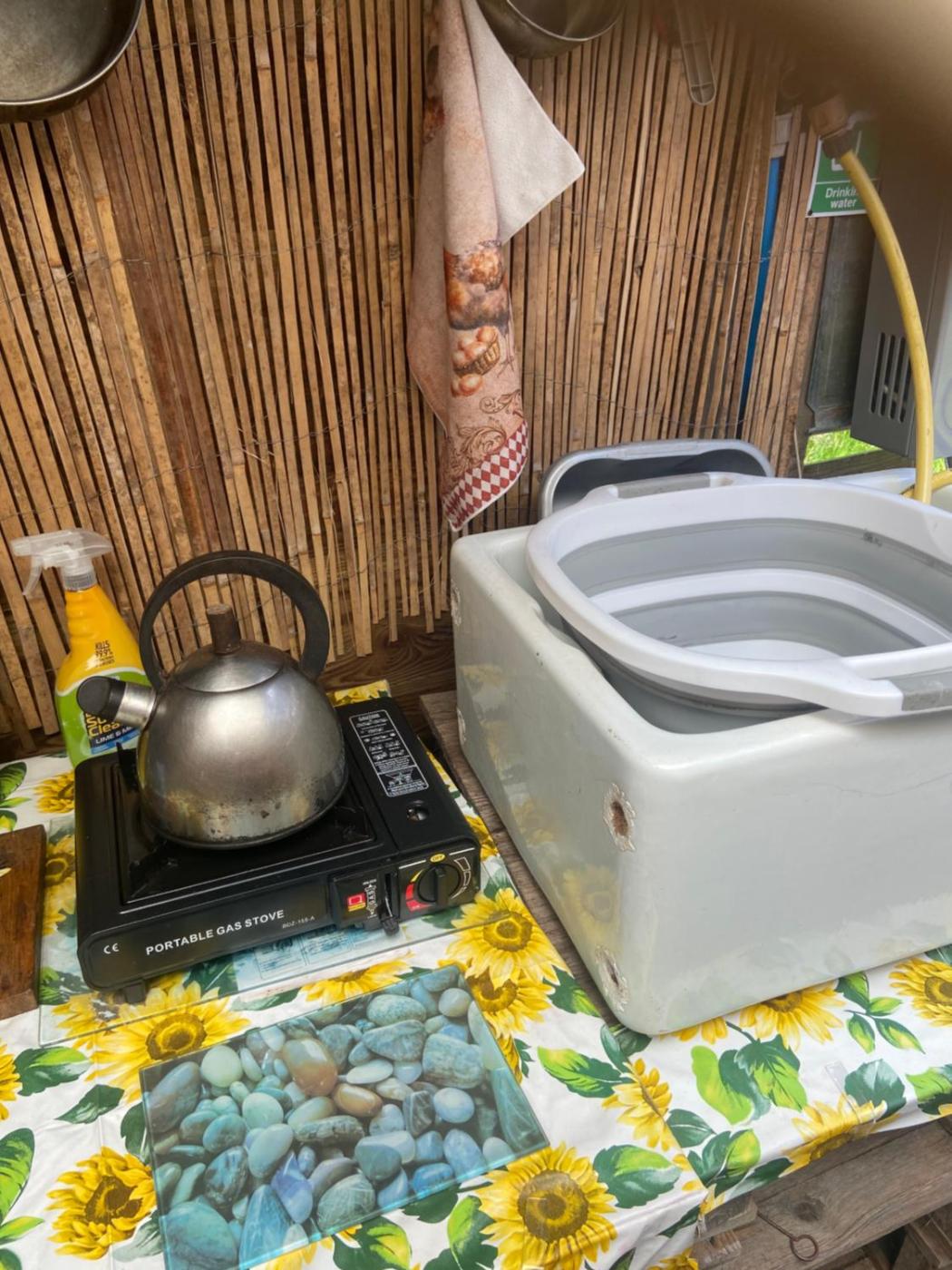 One-Bedroom Chalet. Shepherds hut with sole use of covered outdoor kitchen (including gas camping stove andeating and cooking utensils) BBQfire pit. Sole use of green toilet and shower. ;